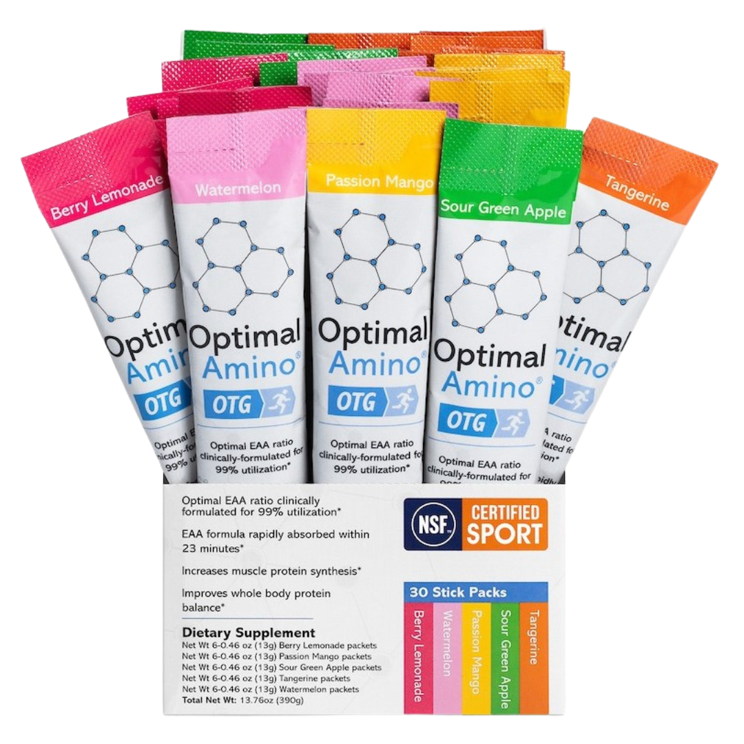 Each OptimalAmino® OTG Variety box contains our incredible OptimalAmino® powder in 30 ultra-convenient, single-serving stick packs in 5 flavors: Berry Lemonade, Passion Mango, Sour Green Apple, Tangerine, and Watermelon.